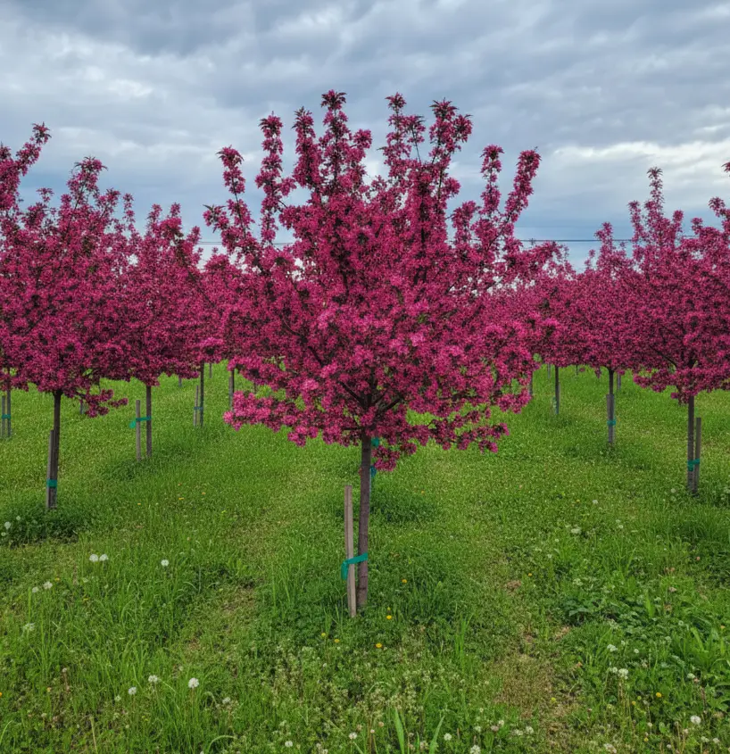 A breathtaking ornamental tree known for its spectacular spring display of deep pink to reddish-purple flowers. These field-grown specimens are carefully staked to ensure a perfectly straight trunk and a uniform, balanced canopy. Beyond its spring beauty, the Crabapple provides year-round interest with small, colorful fruit that persists into winter, attracting local NJ songbirds.Transitioning from stunning spring blossoms to glossy summer foliage, followed by orange-red fall colors and decorative winter fruit.