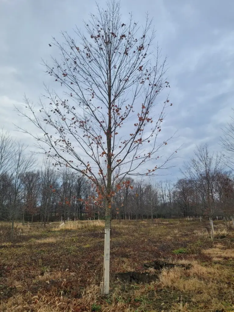 A majestic and hardy shade tree, the Pin Oak is famous for its unique growth habit: upper branches point up, middle branches are horizontal, and lower branches gently sweep downward. This field-grown specimen is incredibly resilient and provides a stunning scarlet-to-bronze display in the fall, often holding its leaves late into the season to provide winter texture for your landscape.Like all oaks, it serves as a vital host plant for local pollinators and provides acorns for birds and squirrels. Highly tolerant of wet soils and the diverse weather conditions of the Mid-Atlantic and New Jersey regions.