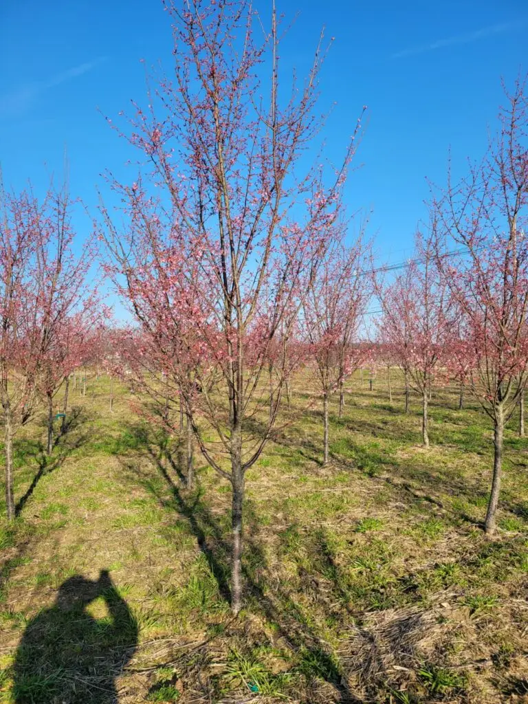 Pink Flowering Cherry Tree, likely the Okame Cherry (Prunus x incamp 'Okame'). One of the earliest flowering cherries to bloom each year, the Okame is prized for its prolific, bell-shaped pink blossoms that signal the arrival of spring. This tree maintains a tidy, upright, and oval shape, making it an excellent choice for smaller NJ residential yards where space is limited but a high-impact focal point is desired. After the spring pink display, the tree develops a clean, bronze-green summer foliage that turns a beautiful bronzy-red to orange in the autumn. Reaches a manageable mature height of 20–25 feet, making it perfect for planting near homes.